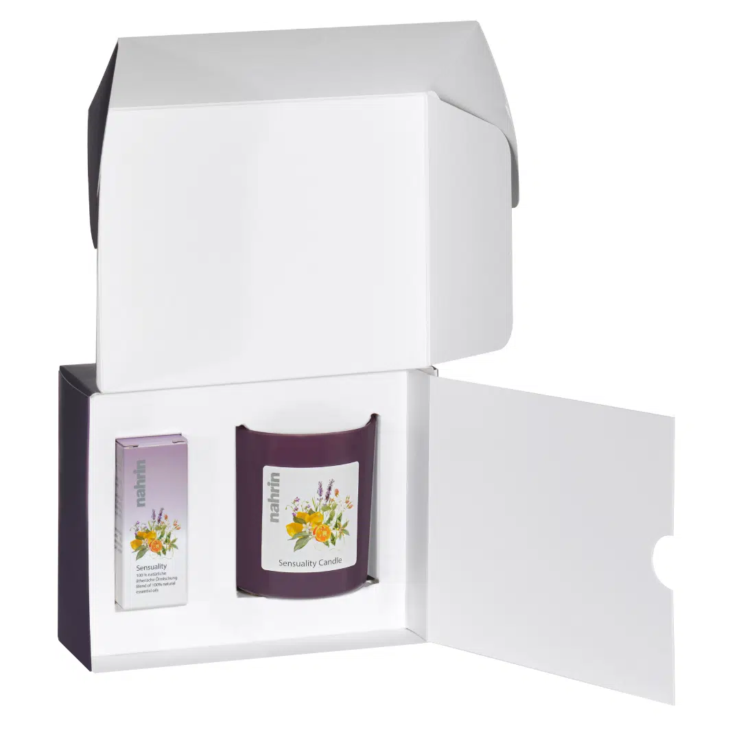Komplektis sisaldub: 15 ml Sensuaalsuse eeterlike õlide segu ning sama eeterlike õlide seguga lõhnaküünal.