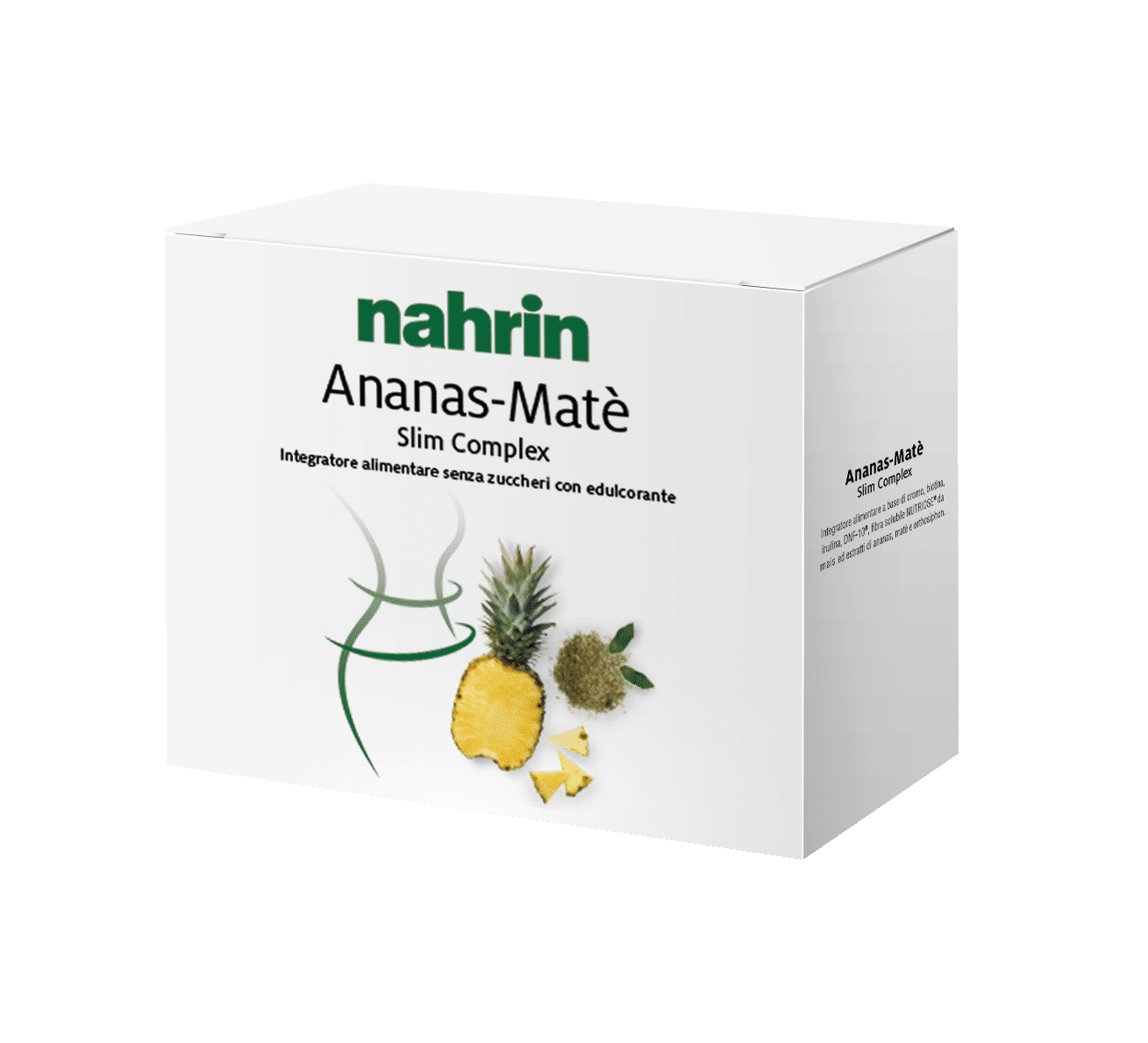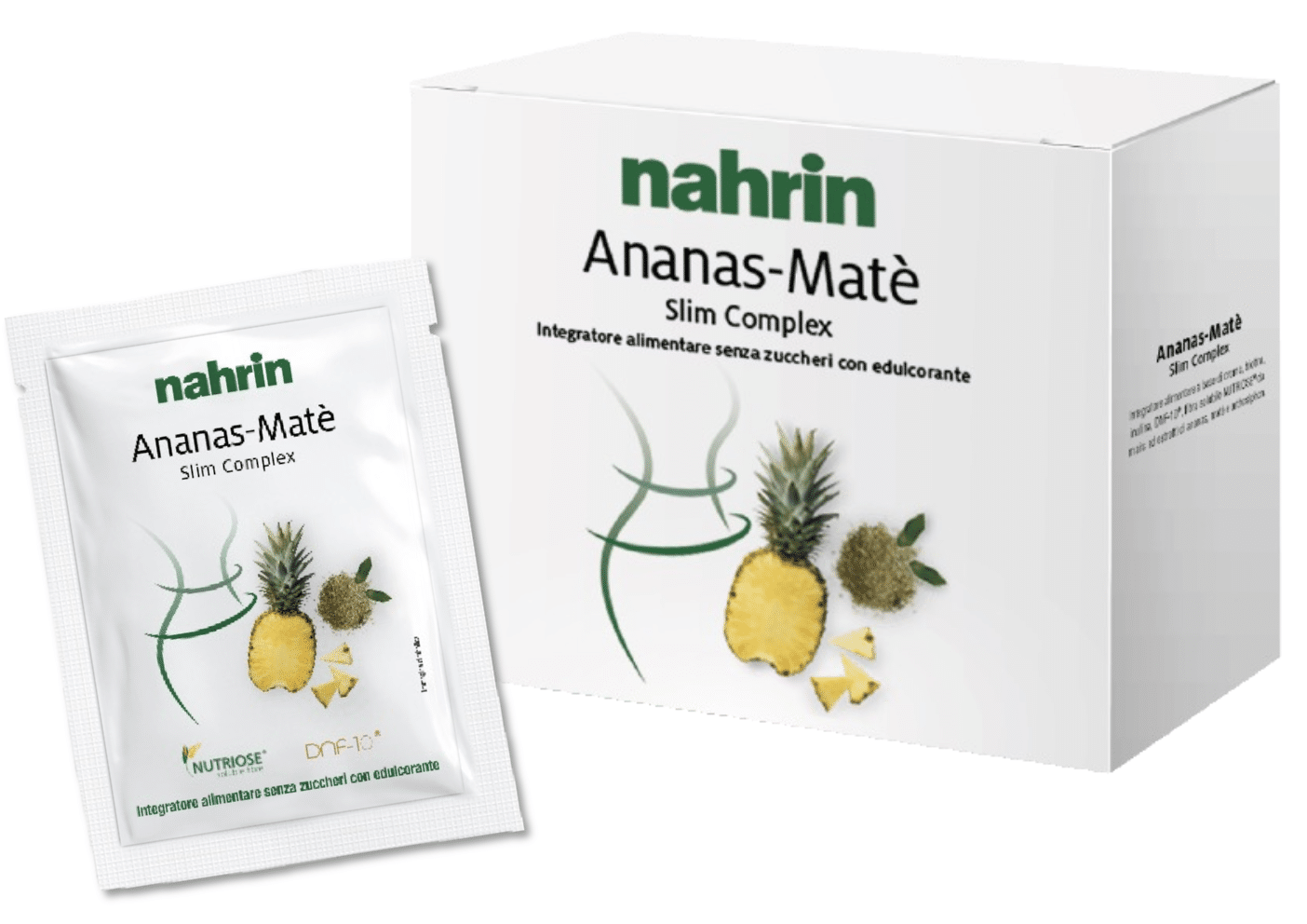 NUTRIOSE rozpuszczalny błonnik kukurydziany, inulina, DNF-10 (hydrolizowane drożdże: peptydy Saccharomyces cerevisiae), suchy ekstrakt z ananasa (Ananas comosus (L.) Merr., łodyga), miareczkowany z 0,3% bromelainy, suchy ekstrakt z ostrokrzewu paragwajskiego (Ilex Aa paraguariensis). Św. -Hil., liście) miareczkowany z 4% kofeiny, suchy ekstrakt z kępki żółtej (Orthosiphon aristatus (Blume) Miq., liście) miareczkowany z 0,1% sinensetyny, aromat, substancja zakwaszająca: kwas cytrynowy; słodzik: glikozydy stewiolowe z liści stewii; substancja przeciwzbrylająca: dwutlenek krzemu; barwnik: beta-karoten; pikolinian chromu, biotyna (D-biotyna).