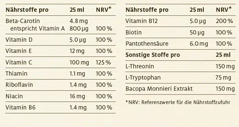 Woda, sok z rokitnika z koncentratu 43% (Hippophae rhamnoides, owoc), sok z moreli z koncentratu 21% (Prunus armeniaca, owoc), rozpuszczalne włókna kukurydziane, witaminy (witamina C (kwas L-askorbinowy), witamina E (octan D-alfa-tokoferylu), niacyna (nikotynamid), kwas pantotenowy (D-pantotenian wapnia), witamina A (beta-karoten), witamina B6 (chlorowodorek pirydoksyny), witamina B2 (ryboflawina), witamina B1 (chlorowodorek tiaminy), D-biotyna, witamina D3 (cholekalcyferol), witamina B12 (cyjanokobalamina)), naturalny aromat, ekstrakt z Bacopa monnieri (Bacopa monnieri L. Wettst., roślina), L-treonina, zagęszczacz (guma ksantanowa, guma arabska), proszek z rokitnika (Hippophae rhamnoides, owoce), L-tryptofan, konserwant: sorbinian potasu, substancja słodząca: sukraloza.