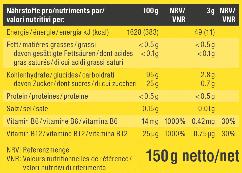 150 mg proszku wystarcza do przygotowania 50 szotów imbirowych z witaminami B6 i B12, bez dodatku cukru.